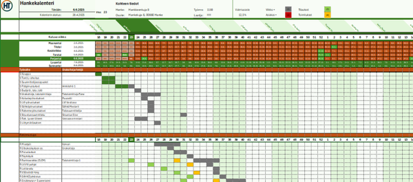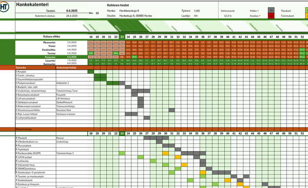Automaattinen kalenteri, joka näyttää todellisten työpäivien määrät ja arkipyhät. Helppolukuinen työvaiheittainen yleisaikataulupohja helpottaa ja tehostaa työmaan suunnittelua ja edistymistä. Aikataulu on helppo käyttää ilman Excel-koulutusta.